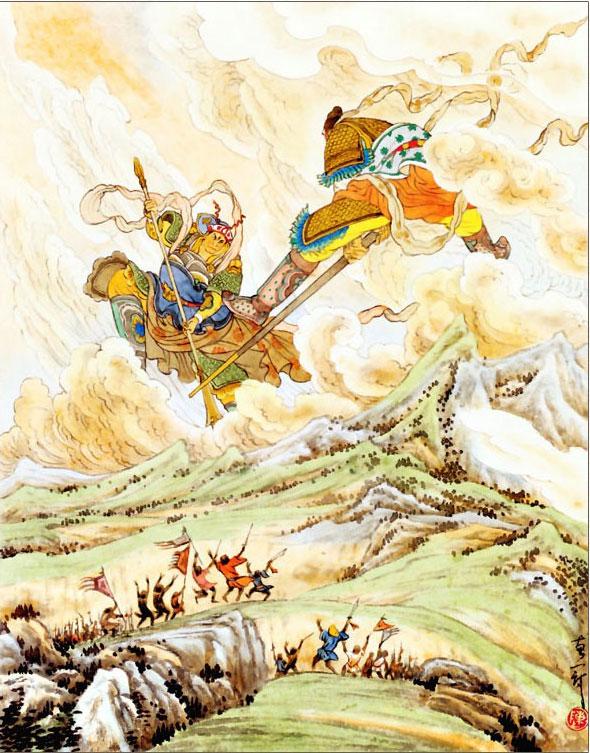 Чудовище свирепость проявляло,Но Хуэй-аня все ж не испугало.Железный посох был непревзойден,Но граблями удар был отражен;И долго над высокими горамиВздымалась пыль огромными столбами,Летели камни, – в черных небесахНа демонов напал великий страх.Один боец – Мокша – был небожитель;Его отец небесный был властитель.Другой же – был прославленный герой,Он много лет придавлен был горой;А тот силен в буддийском был законе,И вот они сошлись на горном склоне.Кто верх возьмет – нельзя предугадать,Кто будет бит?Кто сможет устоять?И вот в самый разгар сражения Гуаньинь, следившая за всем, что происходило внизу, бросила цветок лотоса, который упал как раз между вилами и посохом. Цветок этот привел чудовище в неописуемое удивление.