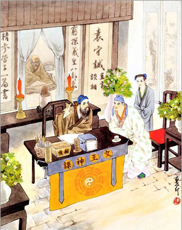 Так, беседуя друг с другом, они добрались до ворот строения, которое заметили издали, и над воротами увидели доску с тремя огромными иероглифами: «Храм местного бога». Они вошли в ворота и во дворе увидели старца, у которого на шее висели четки. Сложив руки и приветствуя их, старец сказал: