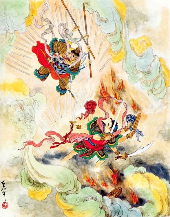 В тот же миг в воздухе появились тысячи таких же, как он Великих Мудрецов, с такими же посохами, украшенными золотыми наконечниками. Они отразили нападение Ночжа и нанесли поражение Духам пяти стран света.