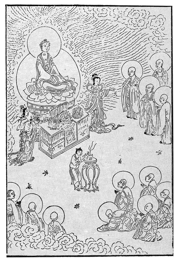 Кругом развевались флаги и знамена, несли балдахины и хоругви, Будде преподнесли сверкающий жемчуг и редкие драгоценности, плоды долголетия, редчайшие изумительные цветы и, почтительно кланяясь, говорили: