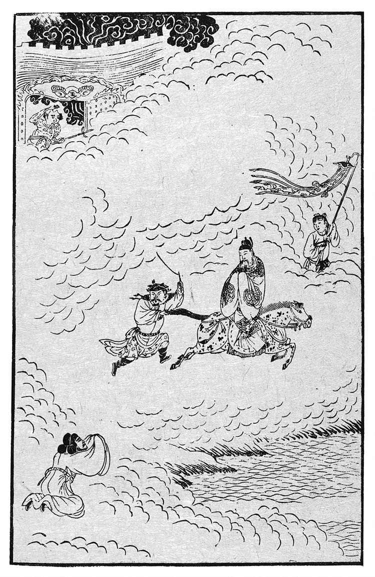 После этого он распрощался с Князем смерти и последовал за Чжу, который шел впереди со знаменем духа-праведника. За ним, охраняя императора, следовал судья Цуй Цзюе. Так они вышли из дворца смерти.