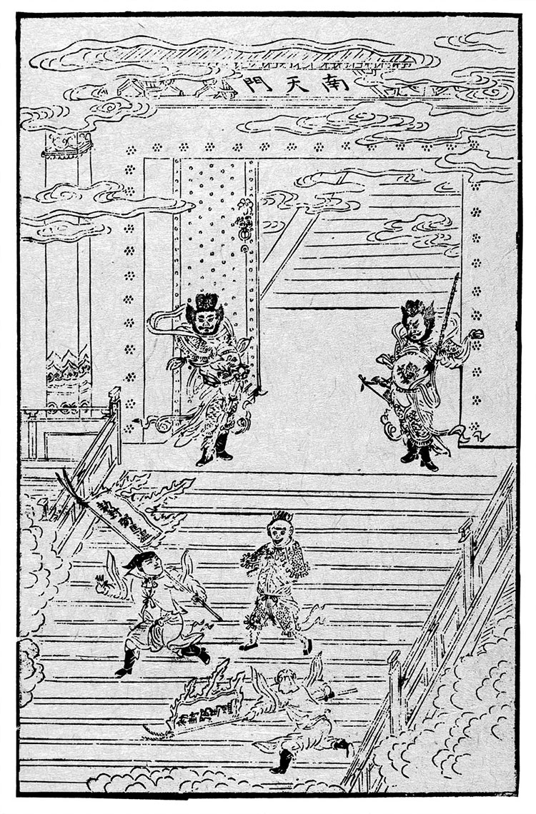 повествующая о том, как Царь обезьян остался недоволен назначением на должность бимавэня, и о том, как он не успокоился даже после того, как стал называться Великим Мудрецом, равным небуИтак, Дух звезды вместе с Прекрасным царем обезьян покинул пещеру. Они сели на облако и поднялись ввысь. А надо вам сказать, что Сунь У-кун передвигался на облаках особым способом и именно благодаря этому двигался необычайно быстро. Очень скоро Дух звезды остался далеко позади, и Сунь У-кун первым прибыл к Южным воротам неба. Однако в тот момент, когда он уже собирался войти, дорогу ему преградил начальник стражи небесных ворот, сопровождаемый большим отрядом охраны, вооруженной пиками, мечами и алебардами.