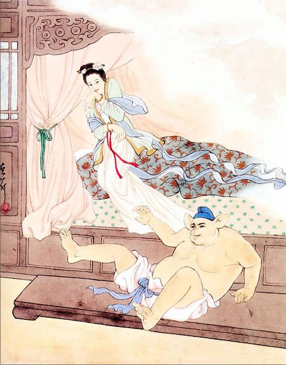 – Наш начальник сказал, что он отправил вас за его матерью, чтобы она отведала мяса Танского монаха и, кроме того, захватила с собой золотой шнур от занавеса для того, чтобы поймать Сунь У-куна. Однако, опасаясь того, что вы можете замешкаться, так как любите полодырничать и тем самым можете задержать выполнение порученного вам важного дела, он решил послать меня, чтобы я поторопил вас.