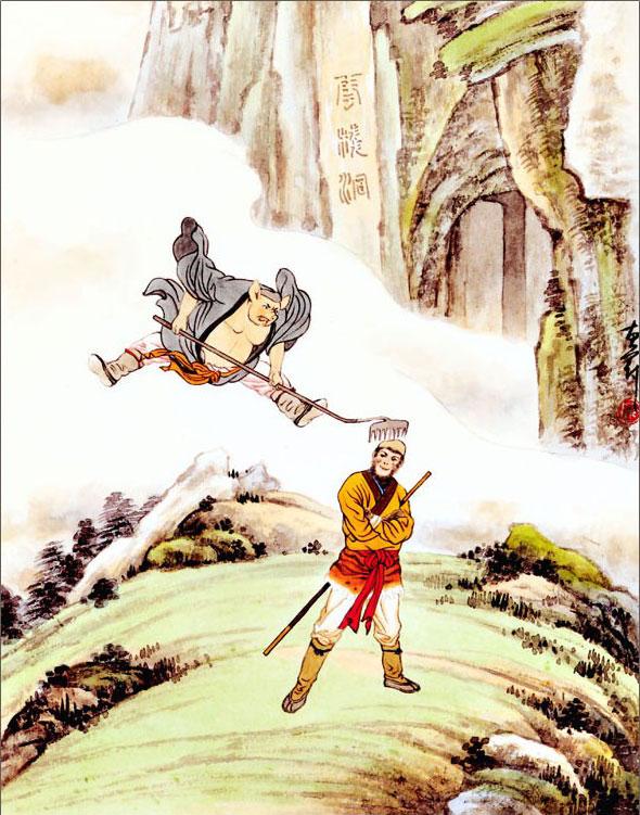 Ша-сэну он приказал оставаться в пещере и охранять учителя, Чжу Ба-цзе велел вооружиться граблями, а сам взял посох и вместе с Чжу Ба-цзе вышел навстречу противнику.