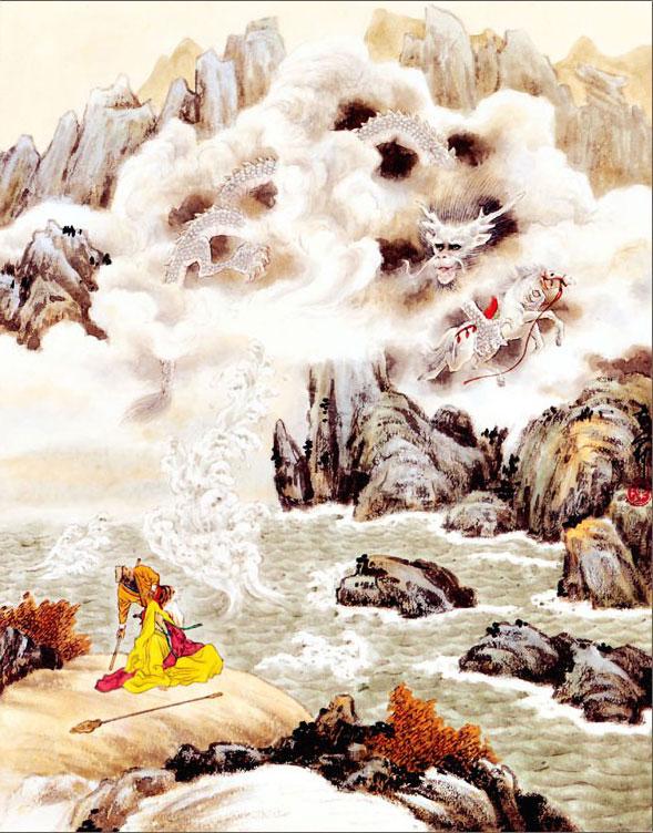 – Вы охраняйте лес, – промолвила бодисатва, обращаясь к остальным небожителям, – а я отправлюсь вместе с ним. И, держа в руках волшебную бутыль, бодисатва поднялась в воздух. Впереди летели два белых попугая, распевая чудесные песни. Сунь У-кун последовал за бодисатвой.