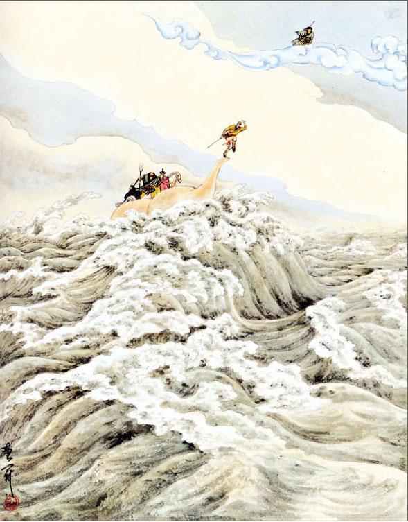 От негодования она даже застонала и с шумом швырнула в море вазу для омовения рук, украшенную жемчугов которую держала в руках. Гнев бодисатвы привел Сунь У-куна в трепет, и он даже вытянулся у трона бодисатвы.