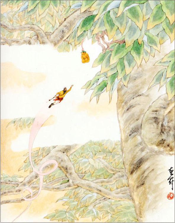 С этими словами Сунь У-кун подлетел к ящику и снова через щель проник внутрь. И тут он увидел то, что нравилось ему больше всего на свете, – он увидел персик. Приняв свой обычный вид и присев на корточки, Сунь У-кун с превеликим наслаждением съел персик и со всех сторон облизал его, оставив одну косточку. Затем, превратившись в цикаду, он подлетел к уху учителя и сказал: