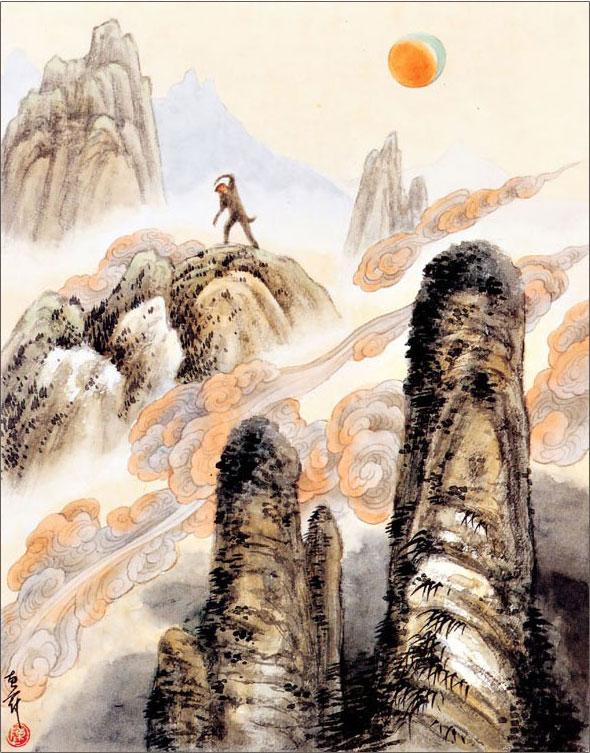 Эти слова успокоили Трипитаку, и он двинулся дальше. Когда они достигли какой-то лощины, Трипитака въехал на утес и огляделся. Перед ним вздымались прекрасные горы.