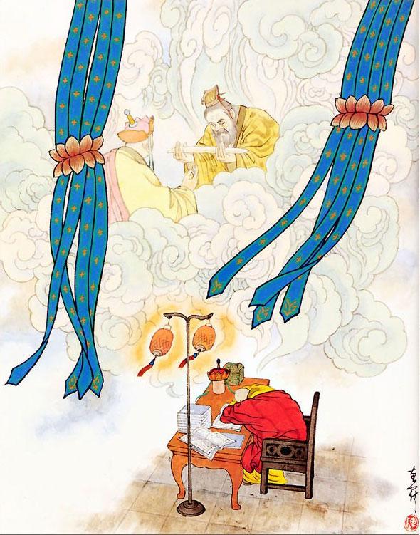 Чжу Ба-цзе, наевшись каши до отвала, вновь почувствовал прилив сил, приосанился, нашел свои грабли и отправился вслед за Великим Мудрецом Сунь У-куном. Они открыли погреб, сняли веревки со всех небесных духов и пригласили их к главному строению.