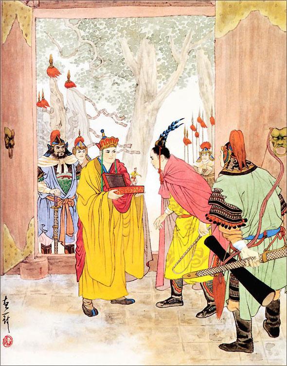 Он тотчас повелел пригласить монаха во дворец. Танский монах, войдя в тронный зал, совершил низкий поклон, как положено по этикету, и пал ниц перед троном. Правитель выразил желание принять его в золотом зале и велел стольничьему приказу приготовить угощение. Танский монах поблагодарил за милость и предъявил свое проходное свидетельство.