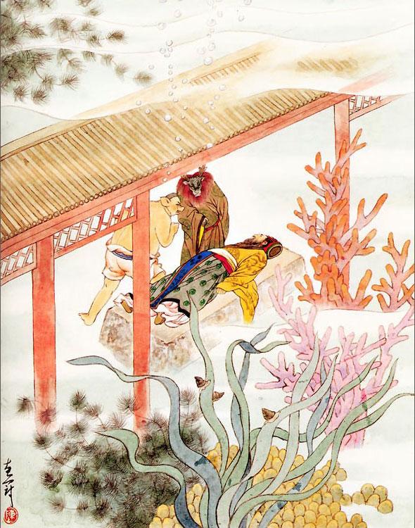 Не успел он проговорить эти слова, как подошли несколько евнухов и стражников, которые совершили низкий поклон перед Сунь У-куном.