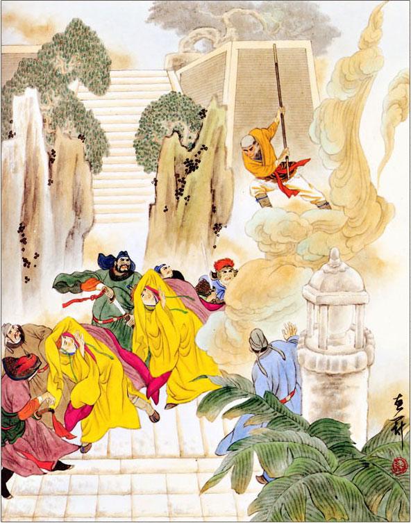 Тем временем Сунь У-кун подошел к даосскому монастырю и, находясь еще за его пределами, вырвал у себя из хвоста семьдесят волосков, дунул на них своим волшебным дыханием и приказал: «Изменяйтесь!» Волоски сразу же превратились в семьдесят двойников Сунь У-куна, только совсем маленьких. затем Сунь У-кун дунул на свой посох с золотыми обручами и снова произнес: «Изменись!» И посох сразу же превратился в семьдесят рогатин с двумя остриями каждая. Сунь У-кун раздал своим крохотным двойникам по одной рогатине, себе тоже взял одну и стал в сторонке. Двойники начали дружно наматывать шнуры на рогатины и вскоре изорвали их на клочки, причем на каждую рогатину намоталось более десяти цзиней, затем из середины они вытащили семь огромных пауков, величиною с целую мерку для риса. Пауки отчаянно шевелили своими лапами, вытягивали головы и вопили: «Пощадите! Помилуйте!». Но семьдесят двойников Сунь У-куна крепко прижали к земле семерых пауков и не отпускали их, несмотря ни на какие мольбы.