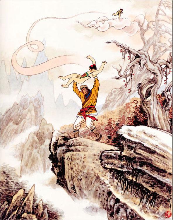– Получив ваше повеление, я тотчас отправился в дозор, – принялся сочинять Сунь У-кун. – Иду себе, как полагается, стучу в колотушку и позваниваю колокольцами, вдруг поднимаю голову и вижу великана, который сидит на корточках и точит железный брус. Я было принял его за духа Хранителя дорог. Если бы он поднялся, то наверняка оказался бы в десять чжан ростом. Сидел он у камня на берегу горного ручья. Обольет камень пригоршней воды, поточит брус, что-то пробормочет и опять сначала. Стал я прислушиваться. Оказывается, он сетовал, что брус не проявил своей чудодейственной силы, что надо наточить его до блеска, а тогда можно будет явиться сюда и… побить вас, великие князья. Тут я смекнул, что это и есть Сунь У-кун, а потому и прибыл доложить вам.