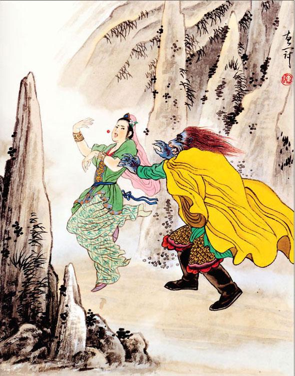 Танский монах до боли стиснул зубы и не промолвил ни слова. Ему не хотелось идти за чародейкой, но он опасался, что она загубит его своими чарами, и, дрожа от страха, последовал за ней в ее благоухающие покои.