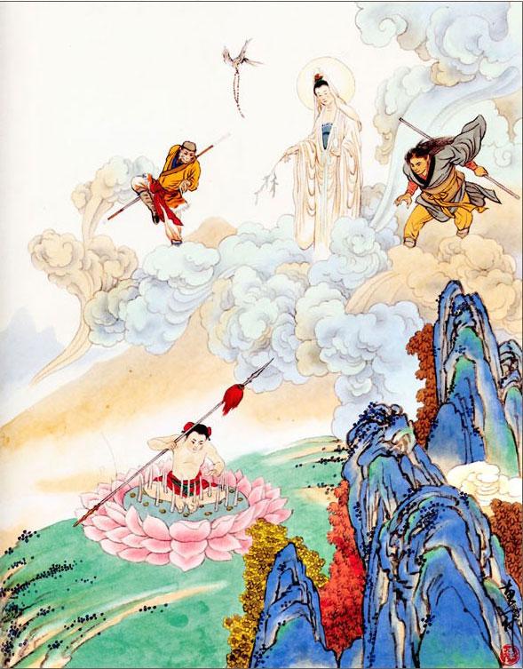 Тогда правитель велел вынести два подноса с рассыпным золотом и серебром и преподнес его монахам на дорожные расходы. Но Танский монах наотрез отказался взять хотя бы крупицу. Однако правитель государства не унимался. Он велел подать царский выезд, предложил Танскому монаху занять место в своей колеснице, и сам вместе с женами и наложницами выкатил ее за ворота дворца. На всех улицах и базарах толпами собрались жители, каждый хотел хоть чем-нибудь проявить свою благодарность: кто подносил воду, кто возжигал душистый ладан; так наших путников провожали до городских ворот. Неожиданно налетел сильный ветер, и с воздуха по обеим сторонам дороги плавно опустились корзины – тысяча сто одиннадцать штук. Дети, которые находились в них, громко плакали. Их незримо охраняли дух-хранитель города, дух местности, духи очагов, повелитель духов пяти стран света, четыре божества времени, небесные посланцы Лю-дин и Лю-цзя и, наконец, духи – хранители кумирен. Обращаясь к Сунь У-куну, они воскликнули: