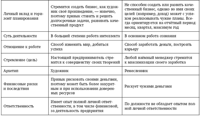 Между крайними вариантами, описанными в Таблице 2, есть, однако, множество полутонов. Люди меняют свои сферы деятельности. Часто успешный предприниматель – это бывший менеджер по найму, набравший опыт и развивший свой интеллект до высокого уровня. А успешный менеджер по найму – это бывший предприниматель, решивший «передохнуть» и поработать за зарплату.