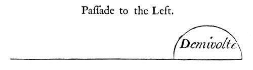 A perfect Passade is made in this Manner. – Your Horse standing strait and true upon all his Feet, you go off with him at once, you stop him upon his Haunches; and in the same Time or Cadence in which he made his Stop, being exactly obedient to the Hand and Heel, he ought to make the Demi-volte, balancing himself upon his Haunches, and so waiting till you give him the Aid to set off again. It is requisite then that the least Motion or Hint of the Rider should be an absolute Command to the Horse. – If you would have him go off at full Speed, yield your Hand, close the Calves of your Legs upon him; if he don't answer to this Aid, give him the Spurs, but you must give them so as not to remove them from the Place where they were, and without opening or advancing your Legs before you strike.