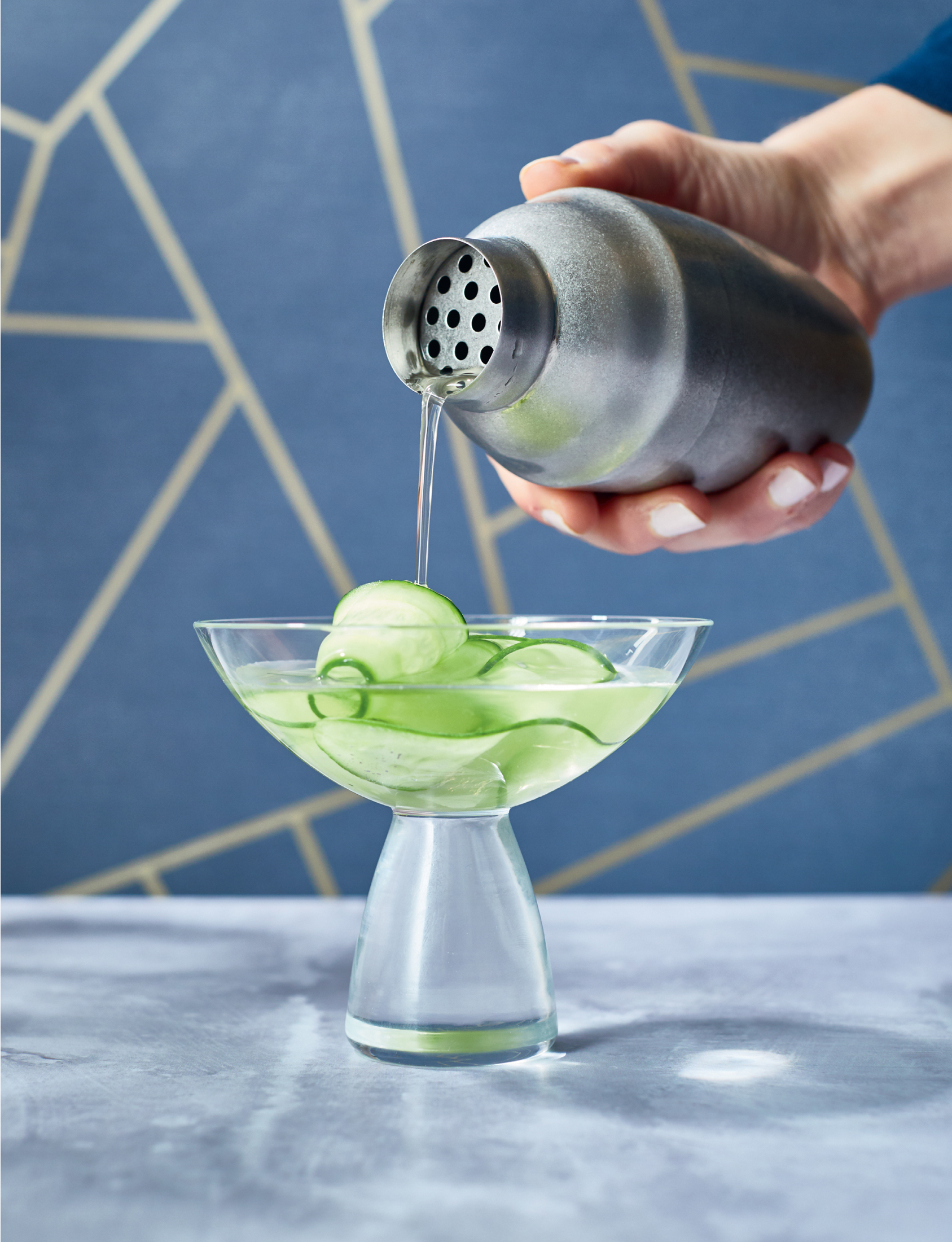 Add all your ingredients to a cocktail shaker, then fill with ice and shake. Strain into a chilled Martini glass or cocktail coupe and garnish with a thin slice of cucumber, or a cucumber ribbon, to serve.