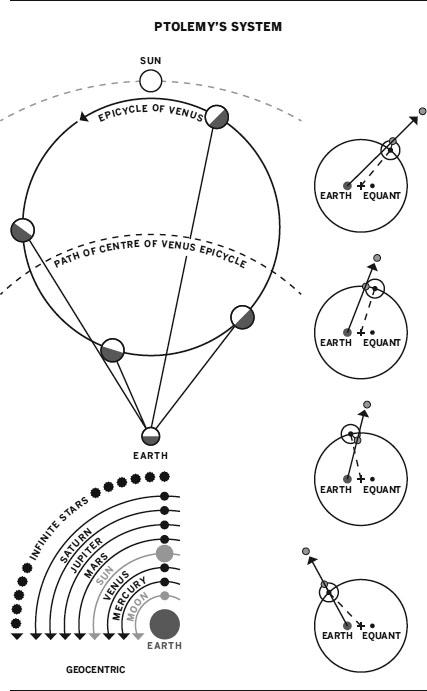 At first sight it is difficult to understand why Ptolemy’s contrived mess lasted so long, but there is a modern bias to this statement that is revealing. Today, a scientifically literate person assumes that there is a real, predictable universe beyond Earth that operates according to laws of nature – the same laws that objects obey here on Earth. This idea, which is correct, only emerged fully formed with the work of Isaac Newton in the 1680s, over a century after Copernicus. Ancient astronomers were interested primarily in predictions, and although the nature of physical reality was debated, the central scientific idea of universal laws of physics had simply not been discovered. Ptolemy created a model that makes predictions that agree with observation to a reasonable level of accuracy, and that was good enough for most people. There had been notable dissenting voices, of course – the history of ideas is never linear. Epicurus, writing around 300 BCE, proposed an eternal cosmos populated by an infinity of worlds, and around the same time Aristarchus proposed a Sun-centred universe about which the Earth and planets orbit. There was also a strong tradition of classic orthodoxy in the Islamic world in the tenth and eleventh centuries. The astronomer and mathematician Ibn al-Haytham pointed out that, whilst Ptolemy’s model had predictive power, the motions of the planets as shown in the figure here represent ‘an arrangement that is impossible to exist’.