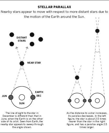 Newton’s laws are the keys to understanding our place in our local neighbourhood. Coupled with precision observations of the motion of the planets and moons, they allow the scale and geometry of the solar system to be deduced, and their positions to be calculated at any point in the future. The nature and location of the stars, however, requires an entirely different approach because at first sight they appear to be point-like and fixed. The observation that the stars don’t appear to move is important if you know something about parallax, as the ancients did. Parallax is the name given to a familiar effect. Hold your finger up in front of your face and alternately close each of your eyes, keeping your finger still. Your finger appears to move relative to the more distant background, and the closer your finger is to your face, the more it appears to move. This is not an optical illusion; it’s a consequence of viewing a nearby object from two different spatial positions; in this case the two slightly different positions of your eyes. We don’t normally perceive this parallax effect because the brain combines the inputs from the eyes to create a single image, although the information is exploited to create our sense of depth. Aristotle used the lack of stellar parallax to argue that the Earth must be stationary at the centre of the universe, because if the Earth moved then the nearby stars would be observed to move against the background of the more distant ones. Thousands of years later, Tycho Brahe used a similar argument to refute the conclusions reached by Copernicus. Their logic was completely sound, but the conclusion is wrong because the nearby stars do move relative to the more distant background stars as the Earth orbits the Sun, and indeed as the Sun orbits the galaxy itself. You just have to look extremely carefully to see the effect.