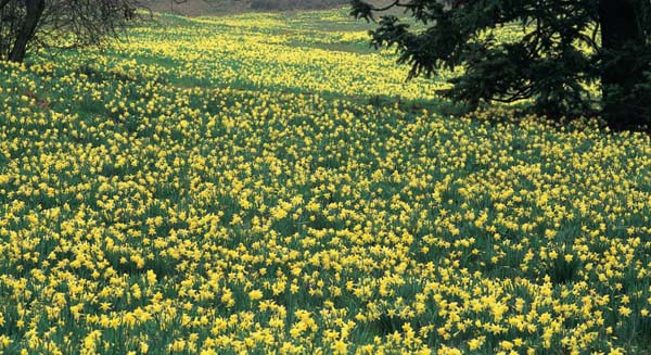 A sea of spring daffodils induces a feeling of calm and well-being thanks to the delicate contrast between the soft, pastel colour of the flowers and the subtle greens of the stems and foliage.