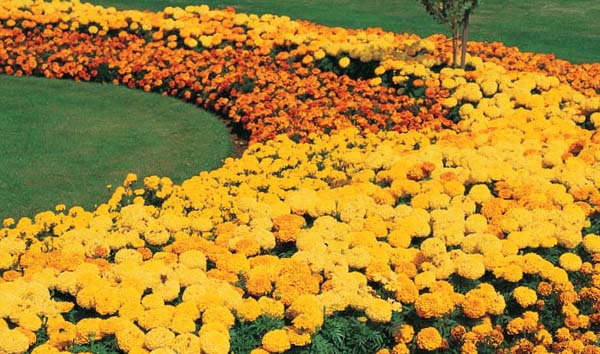 Plants for bedding can be used in exactly the same way as a decorator might deploy paint or carpet – to cover a surface with a chosen colour. These African marigolds, planted after the last frost, in spring, paint a bright golden surface for the whole of the summer. While they flourish, the effect is spectacular, but when the bed is stripped away, only bare soil will remain.