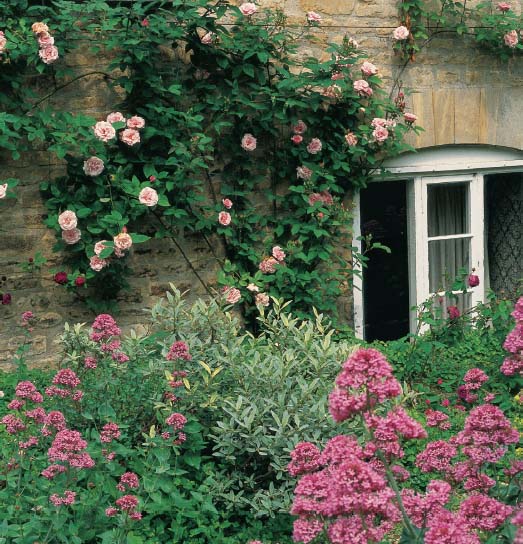 Cottage-style planting works well beneath the walls of a 300 year-old building. The climbing Bourbon rose, ‘Kathleen Harrop’ furnishes the limestone, without hiding too much of it, and teams with the colour of the pink valerian which is allowed to seed around freely.