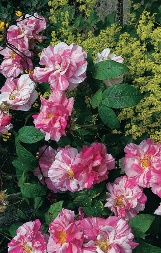 The best plants make multiple contributions. The pink, variegated petals are the obvious asset of this old gallica rose, ‘Rosa Mundi’, but it also provides sweet fragrance and makes a sumptuous texture contrast with the yellow-green lady’s mantle growing nearby.