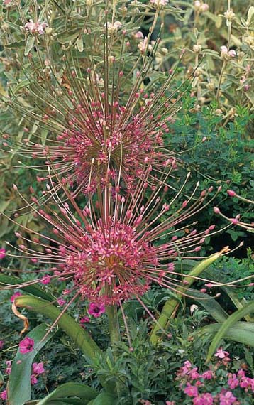 Floral fireworks! The seed heads of Allium schubertii bring a touch of drama to this dense, mixed Mediterranean planting scheme.