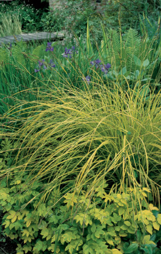 The long, curving leaves of Bowles golden sedge, Carex elata ‘Aurea’ (left), harmonise with the yellow-leaved form of meadowsweet, Filipendua ulmaria ‘Aurea’, while their textures make a dramatic contrast.