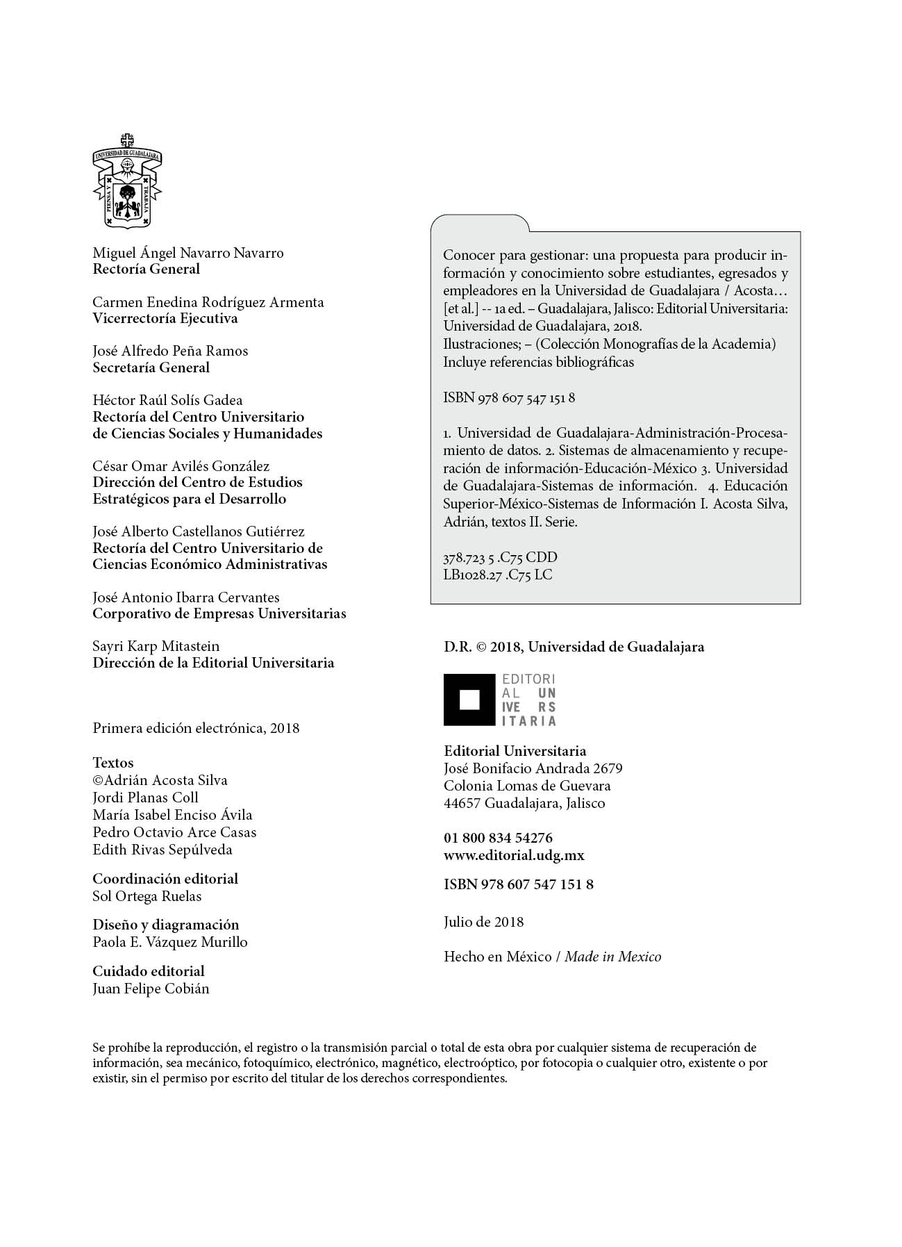 El proyecto llamado Sistema Integrado de Información para el Seguimiento de Estudiantes, Egresados y Empleadores (SIISEEE) es el resultado de varios años de experiencia académica e institucional acumulada en la Universidad de Guadalajara (UdeG). En distintos momentos y por diferentes causas, el interés institucional por generar información útil y pertinente para satisfacer demandas internas y externas de datos sobre estudiantes, egresados y empleadores de los distintos programas de pregrado y posgrado que ofrece la UdeG, se ha combinado con el interés académico de distintos grupos de investigación para explorar dicha información y construir explicaciones satisfactorias sobre la complejidad y diversidad de los comportamientos, perfiles y trayectorias tanto de los estudiantes como de los egresados universitarios.