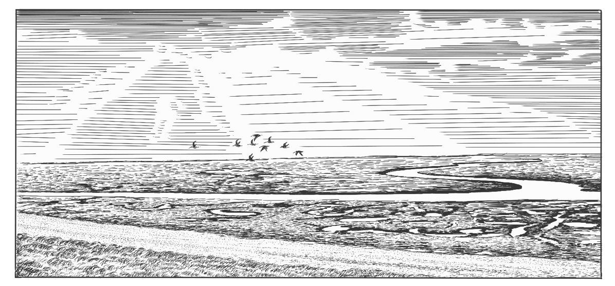 Bulky shelduck patrol the surface of the mud like avian minesweepers, their distinctive upturned bills swishing to and fro, scooping up tiny molluscs. Pink-footed geese stream in from feeding in fields: an airborne, honking choir. Neurotic redshanks strut and fuss, then take fright at the slightest disturbance, sailing into the air, emitting their high-pitched wails. The ‘Sentinel of the Marshes’ they are called, the first to warn of danger; red-legged bird versions of Lance Corporal Jack Jones in Dad’s Army – ‘Don’t panic!’