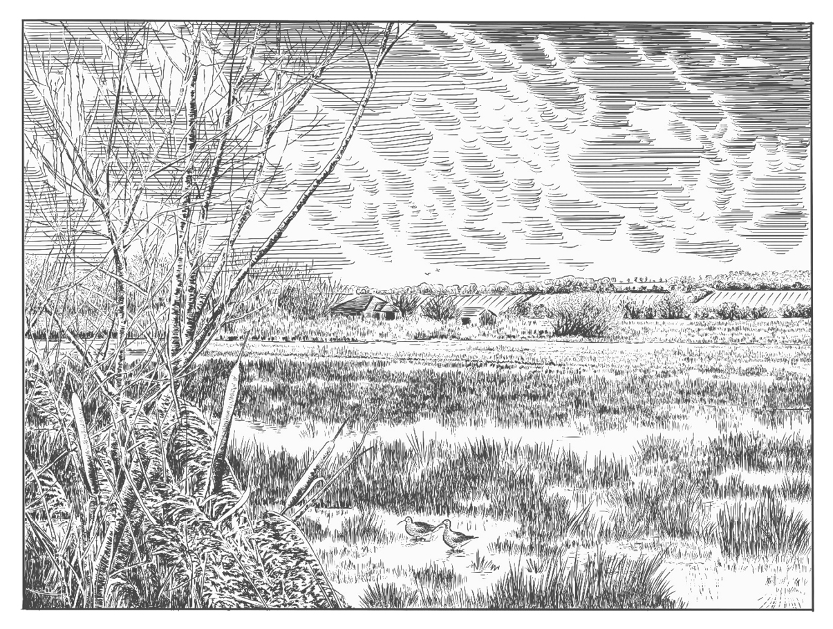 A lacework of bare hedges defines the large field ahead. The ground is sodden and an area of standing water in the middle reflects the grey and pink sky. After a short time, the calls of curlews drift in from the distance. They sail overhead, landing by the water, touching down like fighter planes. Their long, pointed wings tilt to kill the lift and slow momentum. Their heads and necks stretch out and downwards, and their long legs, with pointed toes, dangle below. They delicately touch the earth. At first just a few arrive, then they are joined by more and more. They whistle and call to each other and begin to feed in a herd of about eighty birds, moving first one way, then turning and walking back. A brown hare appears in the background, sniffs the cold wind and lopes away. Occasionally, one curlew rises into the air and sings a succession of ascending notes before floating back to the group. They are trying out their mating displays, and seem restless. Something is stirring in the February air; the approaching spring seems to be awakening their instincts.