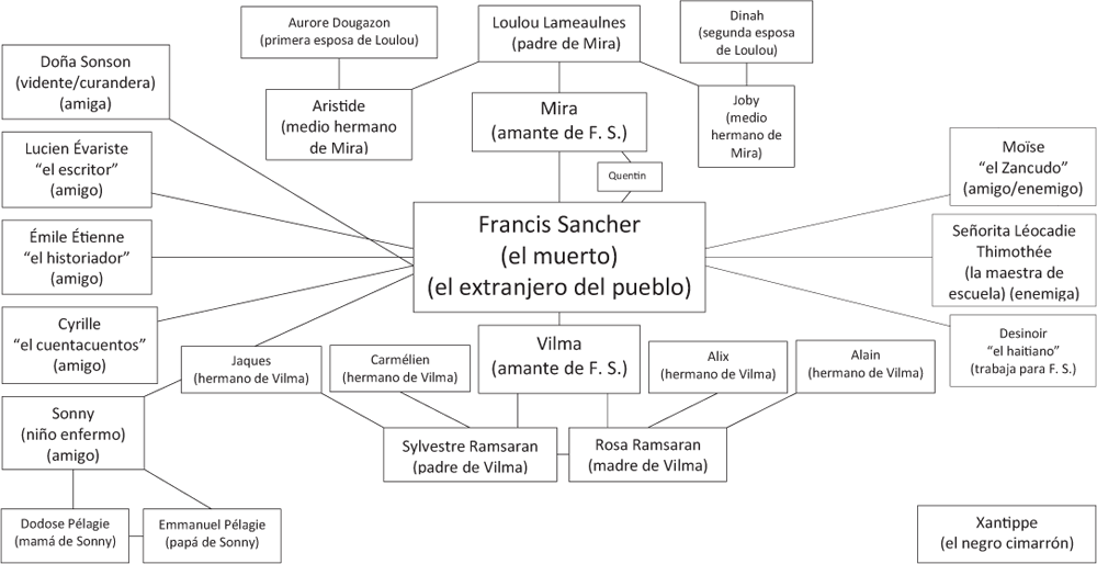 Además, en la novela se usan dos recursos para que el lector hispano entienda lo que los personajes y el narrador dicen en créole. Para las oraciones completas en créole dichas por los personajes, es decir, diálogos y algunas canciones, se usan notas a pie de página; así, en el cuerpo del texto queda sólo el créole, sin ninguna marca, ni siquiera letra cursiva, con el fin de darle a esa lengua del relato un cierto carácter de naturalidad. Sin embargo, los términos aislados en créole y ciertas frases que salen de boca del narrador no se anotan a pie de página, pues el flujo de la narración permite otro recurso que no hace al lector salir de la ficción, bajar la vista y regresar al relato un par de segundos después: junto al término aparece el significado como tal o algún tipo de explicación que permita intuirlo. Todos estos términos créoles se reúnen en un glosario al final del libro, al que se añaden algunos otros elementos culturales para los que el lector hispano difícilmente podría encontrar una explicación en su lengua (personajes de cuentos populares guadalupeños, como el Zapotito; términos de otras culturas o lenguas, como el klerén haitiano; calcos del créole que no se explicaron en el relato porque se apeló al cobijo del contexto, como el ron seco y los platillos regionales).