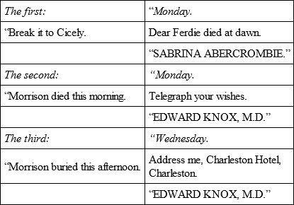 – ”‘Morrison buried this afternoon. Address me Charleston Hotel, Charleston.’ He put those despatches in his pocket and went into the back room. He sat down by the table, and laid his head upon his arms. His shoulders shook, I know he was crying, he was crying for his brother. Oh, I will go down-stairs and tell him the whole; I will go this moment.” She rose.