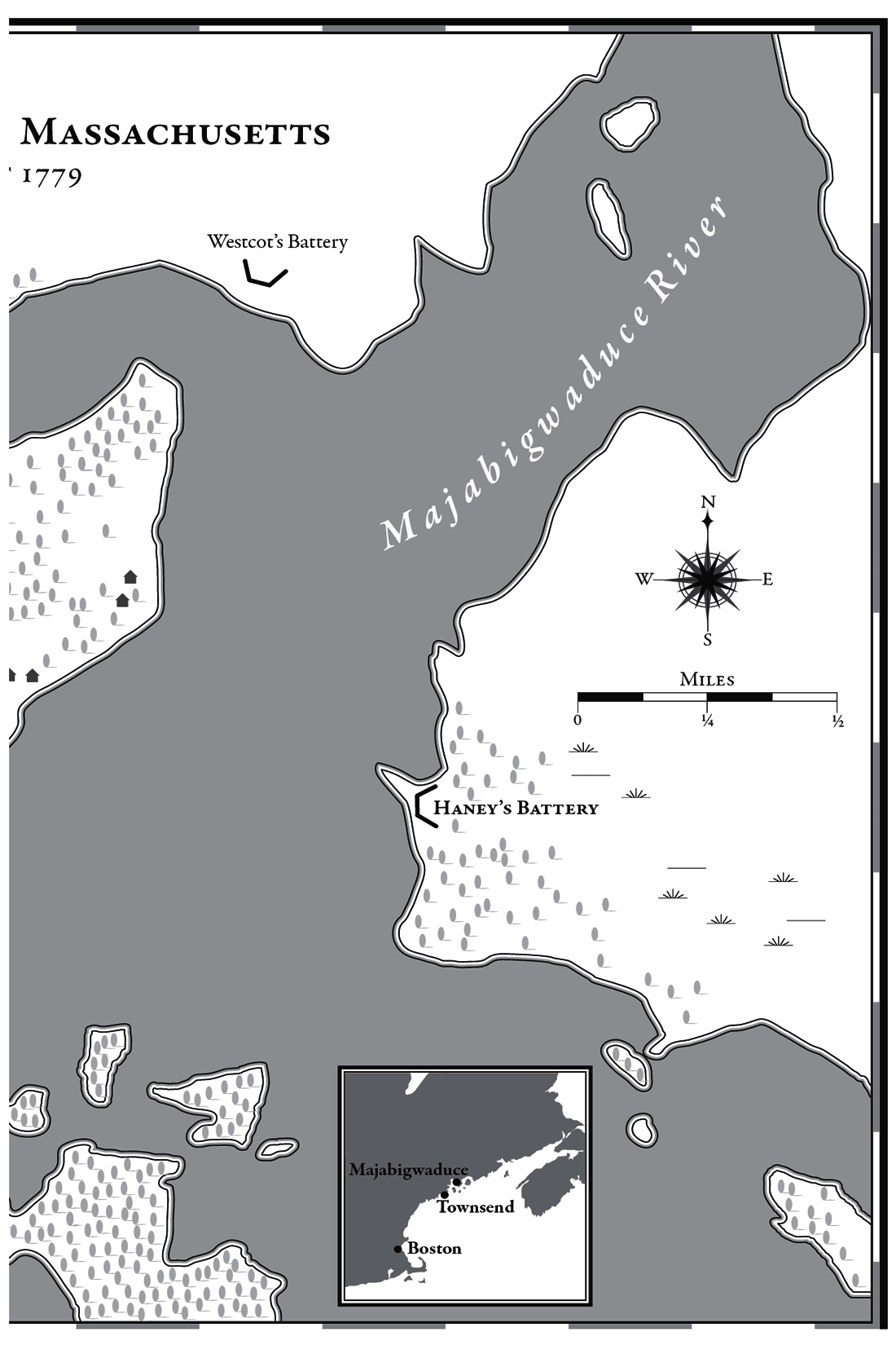 In 1779 there was no state of Maine, it was then the eastern province of Massachusetts. Some place names have also changed. Majabigwaduce is now called Castine, Townsend is Bucks Harbor, and Falmouth is Portland, Maine. Buck’s plantation (properly Plantation Number One) is Bucksport, Orphan Island is Verona Island, Long Island (in the Penobscot River) is now Islesboro Island, Wasaumkeag Point is now Cape Jellison and Cross Island is today called Nautilus Island.