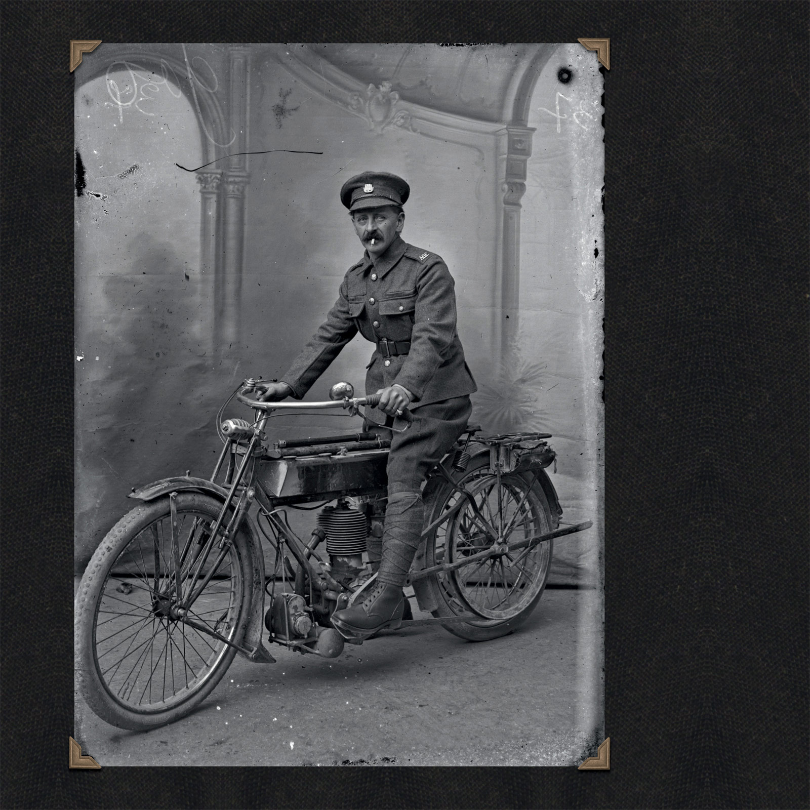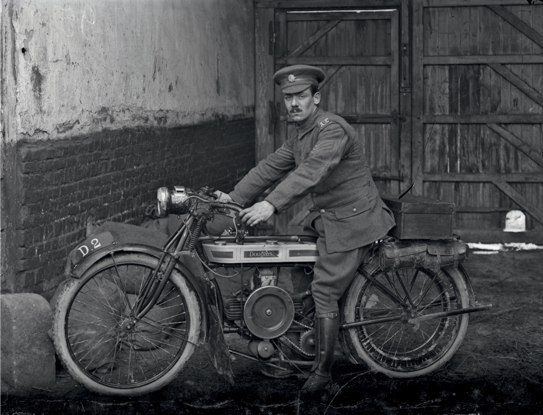 PLATE 53 A sharp image of an Army Services Corps sergeant on a Douglas motorcycle. During the war the Bristol-based Douglas Company supplied more than 70,000 motorcycles. They were used by dispatch riders, signallers and engineers. The ASC sergeant pictured was probably carrying medical supplies in the attached leather cases.