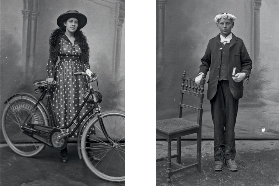 PLATES 57 – 58 A local Vignacourt woman poses in a beautiful polka-dot dress and a boy poses with a garland and communion Bible.