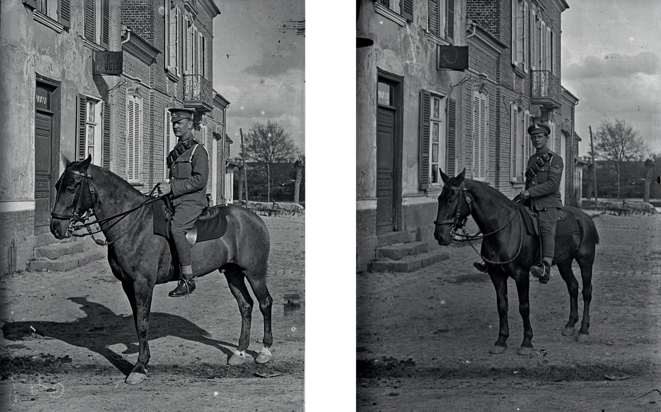 It was another Frenchman, Louis Daguerre, who had invented one of the most important precursors of modern photography, the daguerreotype, in the 1830s – the Polaroid of its day. The daguerreotype produced a single image, which was not reproducible. In the 1850s, more than sixty years before the outbreak of the First World War, William Henry Talbot devised the negative process in which a glass plate negative allowed any number of prints to be made. But the glass plate technology came under threat from the nascent celluloid film cameras produced by Kodak in the late 1880s. By the outbreak of the Great War in 1914, black and white box brownie cameras were relatively common and it is intriguing to speculate just why Louis and Antoinette Thuillier did not opt for the much cheaper film cameras that were by then available. Perhaps the pair were purist professional photographers – and there were many right up even to the 1970s – who continued to favour glass plates because of concerns that the early celluloid films could not provide the sharp images so beautifully rendered by the older glass plate negative technology. Glass plates are still used for photography today in some scientific applications. The problem of sharpness in the early celluloid film cameras was caused by the poor lenses; and nor could early film camera technology provide a sufficiently reliable flat focal plane compared with that provided by a glass plate camera. This was because the celluloid film, although stretched across the back of the camera, still curved slightly and this made for less crisp images. All the better for amateur historians a century later, because the glass plate negatives used by the Thuilliers allow for an extremely high-quality print in comparison with the old celluloid film negatives, most of which have degraded to the point where they are unusable.