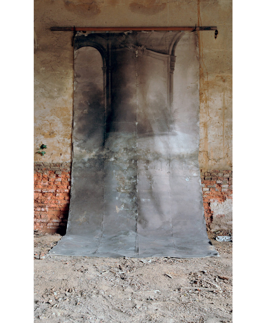 Never did we think it possible that the backdrop used by Louis and Antoinette Thuillier could have survived nearly a century in a dusty attic. But, as we fumbled around in the eaves of the family attic in Vignacourt back in early 2011, we found, wedged between two roof beams, a tight roll of canvas mounted on a wooden pole. Eager to see what was inside, but anxious not to damage it, we lugged the dusty canvas roll down the three flights of stairs to the courtyard … and gently unrolled it.