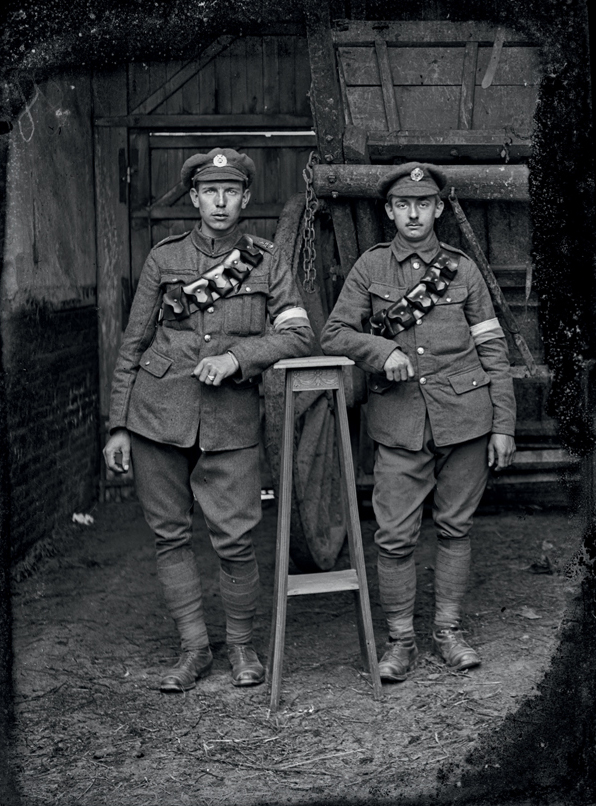 PLATE 70 Two soldiers of the Royal Engineers Corps pose in the Thuilliers’ farmyard. Both wear armbands indicating they were in the Royal Engineers Signal Service. The soldier on the left wears the distinctive ‘T’ of the territorial force on his left shoulder.