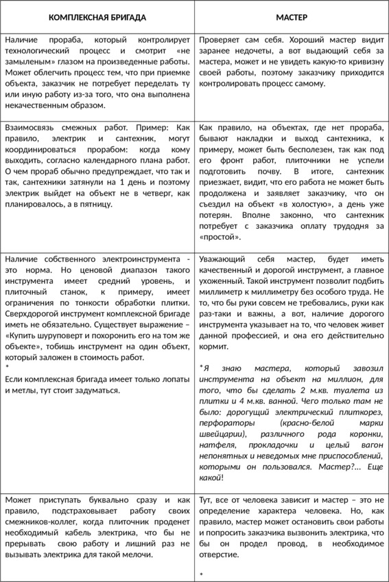 И еще один момент. Возможно, что объект ведет комплексная бригада, но вот бригадный плиточник не может сделать должным образом то, что планируется на объекте. Грамотный прораб наймет мастера-плиточника, который сделает определенный вид работы, а маляры, электрики и сантехники, продолжат свои работы в составе команды комплексной бригады, а бригадный плиточник будет делать менее квалифицированные плиточные работы на данном объекте. Бывает и такое.