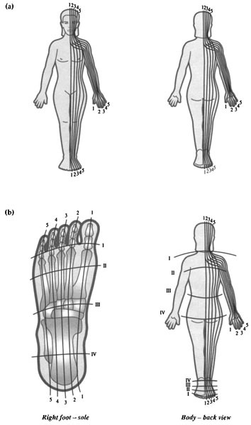 Figure 1.10 (a) The zones of the body according to Dr William Fitzgerald. (b) Corresponding longitudinal and lateral zones in the body and the foot.
