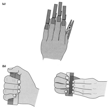 Pressure was often applied using aluminium combs, pointed instruments, tight elastic bands, clothes pegs or clamps on the fingers or toes (figure 1.12). Fitzgerald also spoke of how to use pressure with fingers and thumbs from anything between 1 and 4 minutes. The use of the many non-electrical applications such as surgical clamps, aluminium combs, elastic bands, pegs and percussion motors never really caught on because they were so invasive. Fitzgerald also had ‘therapy bites’ and ‘therapy grips’; these were saw-edged articles or sometimes just metal combs. He even used rubber erasers. However, hands and the precise techniques of the correct pressure were all that was really needed.
