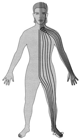 Figure 1.13 Merging of the meridians, making six lines of energy either side of the medial line