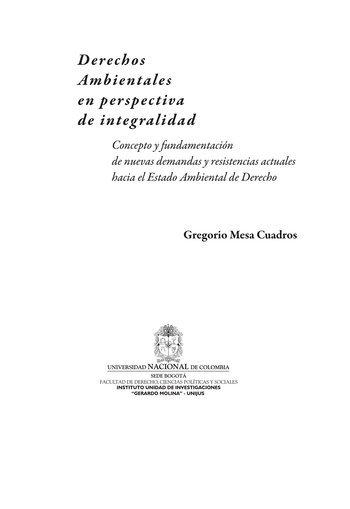 Derechos ambientales en perspectiva de integralidad : concepto y fundamentación de nuevas demandas y resistencias actuales hacia el estado ambiental de derecho / Gregorio Mesa Cuadros. -- Cuarta edición, primera reimpresión. -- Bogotá : Universidad Nacional de Colombia. Facultad de Derecho, Ciencias Políticas y Sociales. Instituto Unidad de Investigaciones Jurídico Sociales Gerardo Molina (UNIJUS), 2019 (impresión de 2019).