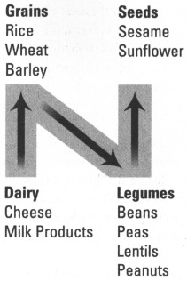 The phrase “Don’t Get Love Sick” (Dairy, Grains, Legumes, Seeds) may help you remember the four groups and the order in which they form the nutritional N. Just string the four elements together in alphabetical order. A combination of any two consecutive initial letters of the phrase will provide complete proteins. Dairy and Grains (D & G), for instance, will form a complete protein together, whereas dairy and legumes will not. The other two complete protein combinations are Grains and Legumes (G & L) or Legumes and Seeds (L & S).