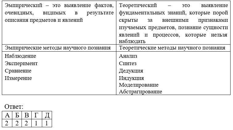 Вспоминаем теорию. Научное познание – это вид познавательной деятельности человека, направленной на получение объективных, систематизированных, обоснованных и организованных знаний о природе, человеке и обществе. Уровни научного познания: