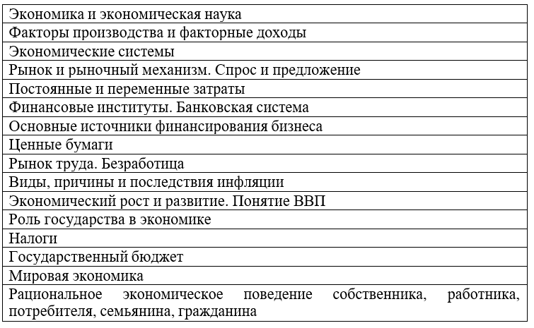 «налоги», «банковская система», «ценные бумаги», «инфляция» и т. д.)