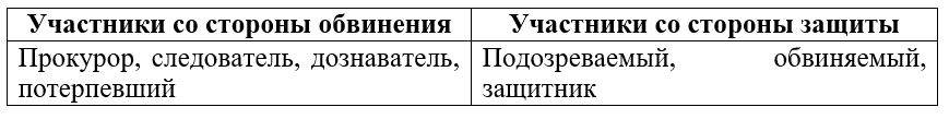 Для правильного выполнения данного задания необходимо вспомнить Уголовно-процессуальный кодекс (главы 6, 7), а именно участников уголовного судопроизводства со стороны обвинения и со стороны защиты.